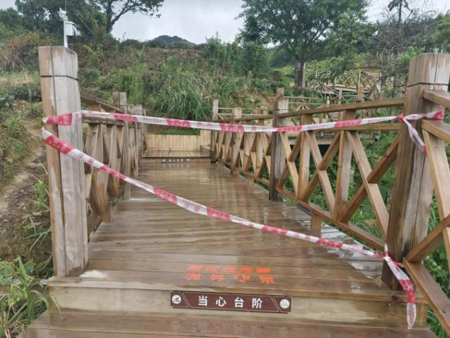 瑯?gòu)止窘M織佛子山景區(qū)游步道項(xiàng)目、外屯游客服務(wù)中心防臺防汛安全排查,加強(qiáng)對高陡邊坡等重點(diǎn)部位巡查、拉好警戒線等。