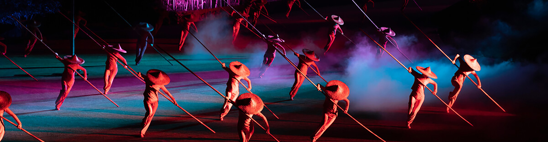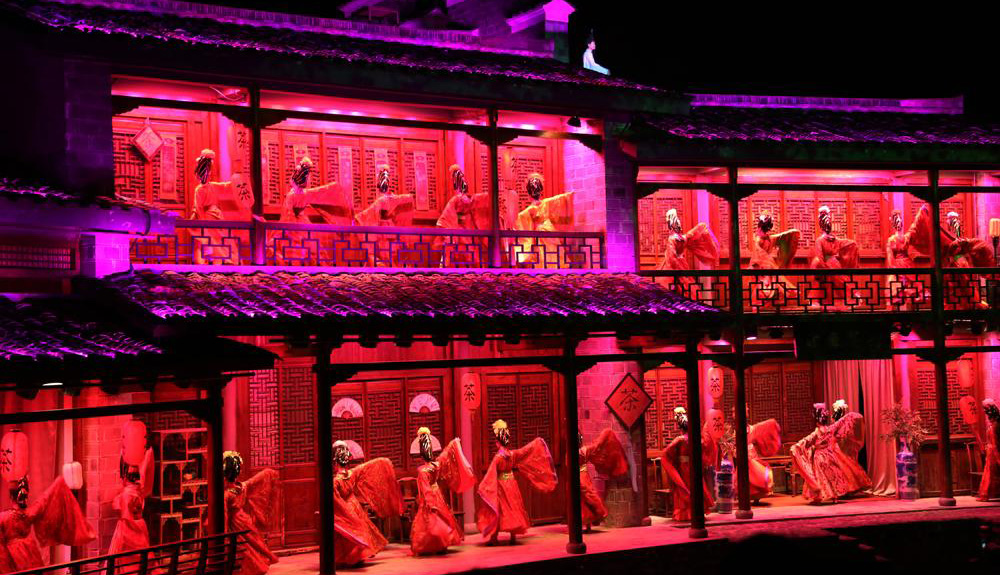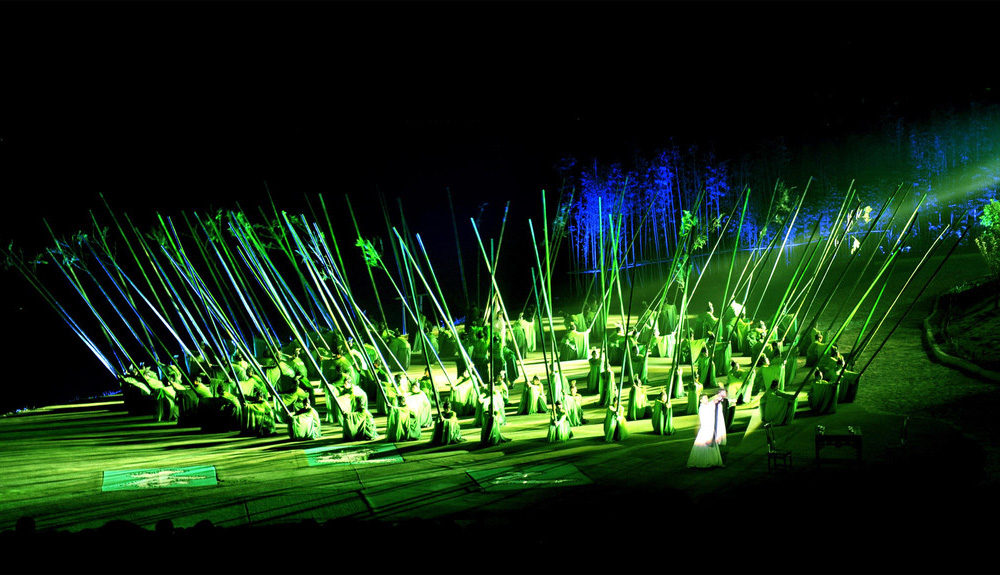 由420名武夷山當地民眾參與演出的《印象·大紅袍》山水實景演出,宣稱“轉著看演出”,“實景電影”和360度旋轉觀眾席是其最大的看點。演出舞臺坐落在武夷山國家旅游度假區(qū)武夷茶博園西南角、崇陽溪東+側河岸,背倚風光綺麗的武夷山水。演出以茶樓的胖老板與朋友們聊天為開場。隨即觀眾席開始朝著“印象茶館”的方向旋轉,眾多唐代仕女出門迎客,近百位演員的低胸裝竟然克隆自《滿城盡帶黃金甲》!當舞臺來到一片空地時,“竹林大戰(zhàn)”頓時上演:幾十位綠衣少年每人擎起一根人工竹子構成竹海,兩位一身白衣的“詩人”被威亞吊到竹林上空飛舞,儼然《十面埋伏》加《英雄》;當舞臺旋轉至“印象茶館”時,《三槍》里的“麻子面館”老板又現(xiàn)身了……