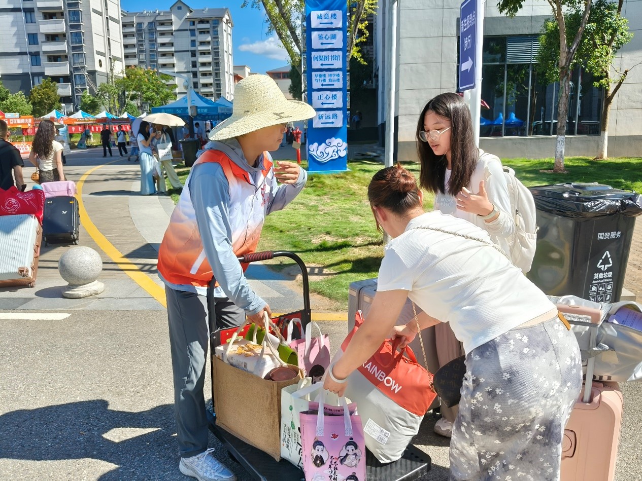 “同學(xué)你好,報(bào)到處請往這邊走。”“同學(xué),請乘坐前方車輛前往宿舍。” 迎新當(dāng)天,志愿者們冒著高溫,始終熱情地為新生提供指引和幫助。他們分布在校園入口、教學(xué)樓和宿舍區(qū)等重要位置,為新生及家長答疑指路,協(xié)助搬運(yùn)行李,盡力讓每一位新同學(xué)感受到便利與溫暖。