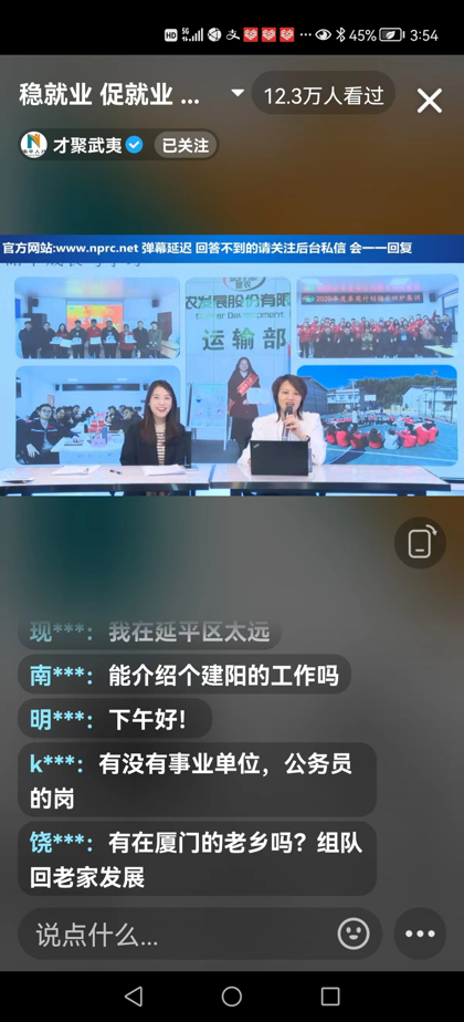 10月9日起,福建武夷旅游集團(tuán)“才聚武夷”抖音直播間助力南平市人社局開展“金秋招聘月”活動(dòng),并聯(lián)合抖音官方創(chuàng)新舉辦“dou來(lái)云招聘——局長(zhǎng)攜企送崗直播招聘會(huì)”系列活動(dòng)。截止目前,南平市人社局、浦城縣人社局、松溪縣人社局分別攜圣農(nóng)集團(tuán)、太陽(yáng)電纜、華誼三愛富科技等23家優(yōu)秀企業(yè),為線上網(wǎng)友提供地方經(jīng)濟(jì)建設(shè)前景展示、南平人才政策、企業(yè)實(shí)力、企業(yè)發(fā)展規(guī)劃、崗位薪酬、崗位福利、人才培養(yǎng)等咨詢服務(wù)。累計(jì)吸引求職人員和潛在求職人員觀眾28.8萬(wàn)人次,“才聚武夷”求職粉絲凈增657人,南平人才網(wǎng)收集求職簡(jiǎn)歷423份,為參會(huì)企業(yè)儲(chǔ)備一批優(yōu)秀人才資源的同時(shí),進(jìn)一步擴(kuò)大品牌宣傳。