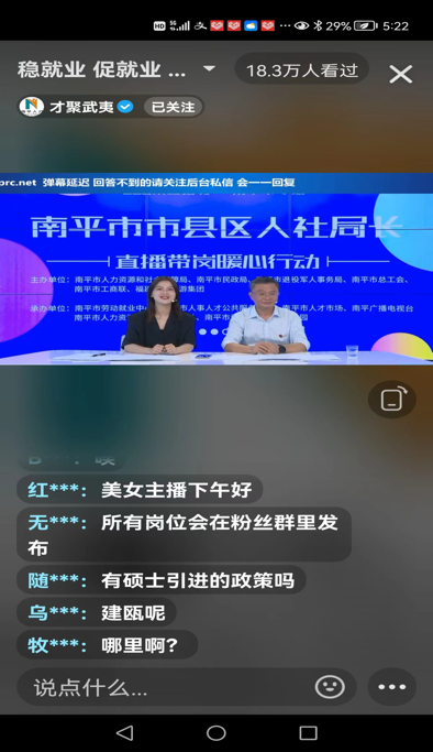 據(jù)悉,南平市人社局黨組書記、局長(zhǎng)李書標(biāo)將于10月27日,親自走進(jìn)直播間,攜元力活性炭、青松化工、長(zhǎng)富乳品、永晶科技等6家實(shí)力企業(yè),參加“dou來(lái)云招聘——局長(zhǎng)攜企送崗直播招聘會(huì)”。10月底也將陸續(xù)舉辦政和縣、武夷山市、順昌縣、邵武市等人社局長(zhǎng)攜企送崗直播招聘會(huì)。