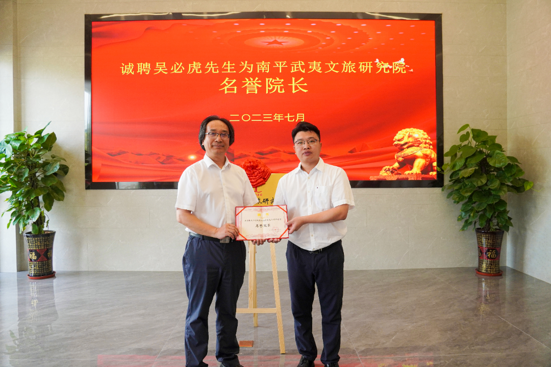 7月9日,南平市副市長林湫、北京大學城環(huán)學院旅游研究與規(guī)劃中心主任吳必虎為南平武夷文旅研究院揭牌。集團黨委書記、董事長葉厚德向吳必虎教授頒發(fā)聘書,總經(jīng)理許周妹、紀委書記葉宏榮、科技副總經(jīng)理吳志博參加儀式。