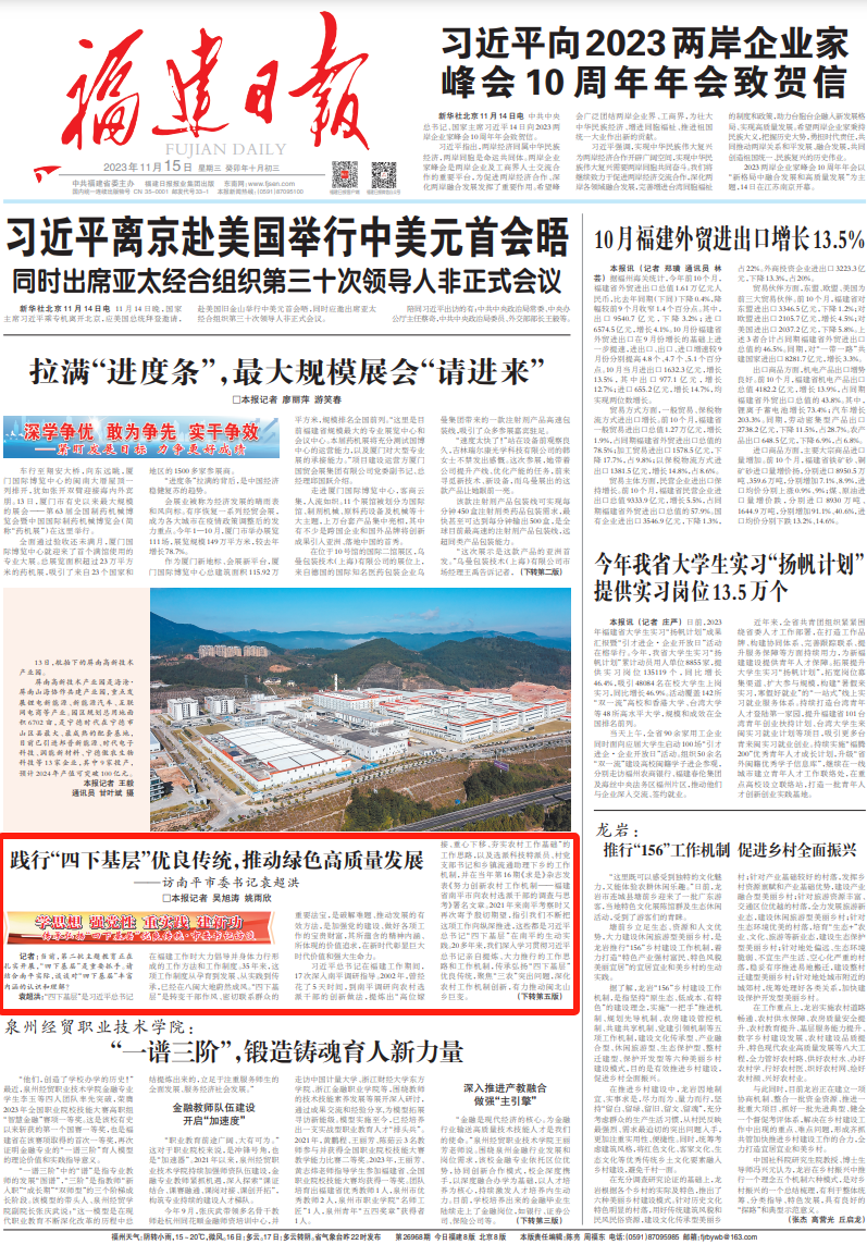 11月15日,福建日報頭版刊發(fā)《踐行“四下基層”優(yōu)良傳統(tǒng),推動綠色高質(zhì)量發(fā)展——訪南平市委書記袁超洪》一文,全文如下——