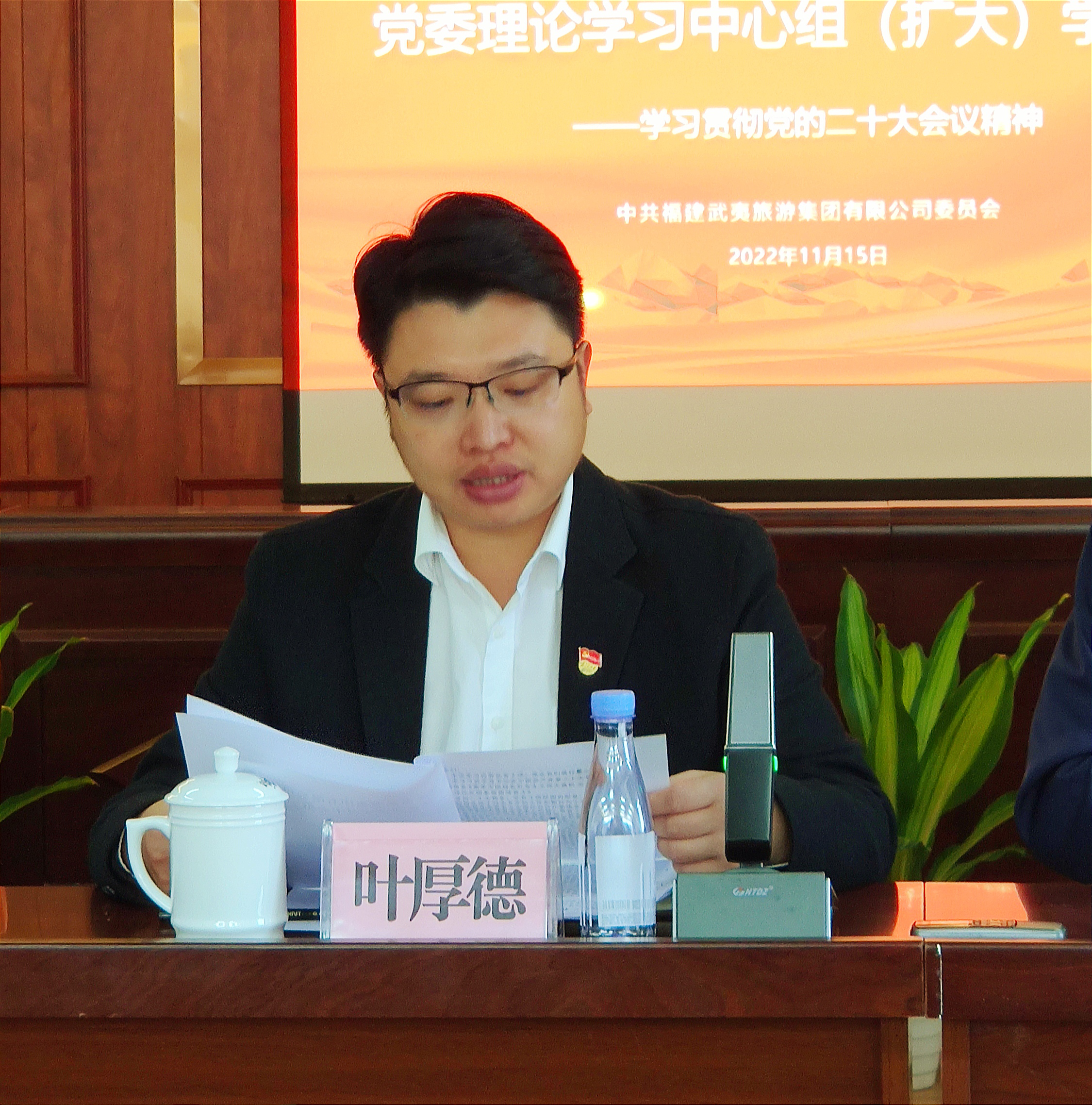 11月15日上午,武夷旅游集團(tuán)黨委召開理論學(xué)習(xí)中心組學(xué)習(xí)(擴(kuò)大)會(huì)議,集中學(xué)習(xí)黨的二十大會(huì)議精神并交流研討。會(huì)議由集團(tuán)黨委書記、董事長(zhǎng)葉厚德主持,市國資委黨委副書記劉建斌和黨辦負(fù)責(zé)人游榮青到會(huì)巡聽,武發(fā)集團(tuán)、實(shí)業(yè)集團(tuán)、綠發(fā)集團(tuán)和武夷股份公司代表列席旁聽,集團(tuán)公司黨委及班子成員、各部門負(fù)責(zé)人,所屬黨支部書記、在潭子公司負(fù)責(zé)人參加會(huì)議。