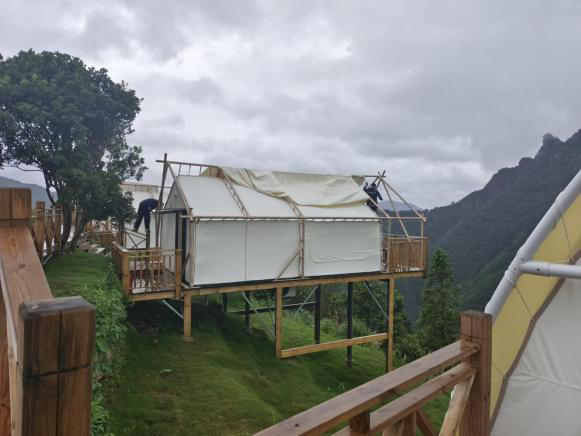 福建省武夷山旅行社深入政和縣天村稠嶺露營地,對帳篷及大型家具物品進(jìn)行加固和檢查,拆除露營地帳篷外帳,轉(zhuǎn)移帳篷物資,檢查排水管道,設(shè)置警戒線,做好臺風(fēng)防御工作。