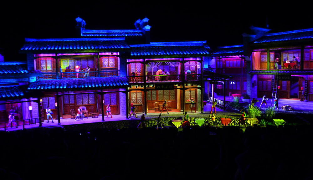 由420名武夷山當地民眾參與演出的《印象·大紅袍》山水實景演出,宣稱“轉著看演出”,“實景電影”和360度旋轉觀眾席是其最大的看點。演出舞臺坐落在武夷山國家旅游度假區(qū)武夷茶博園西南角、崇陽溪東+側河岸,背倚風光綺麗的武夷山水。演出以茶樓的胖老板與朋友們聊天為開場。隨即觀眾席開始朝著“印象茶館”的方向旋轉,眾多唐代仕女出門迎客,近百位演員的低胸裝竟然克隆自《滿城盡帶黃金甲》!當舞臺來到一片空地時,“竹林大戰(zhàn)”頓時上演:幾十位綠衣少年每人擎起一根人工竹子構成竹海,兩位一身白衣的“詩人”被威亞吊到竹林上空飛舞,儼然《十面埋伏》加《英雄》;當舞臺旋轉至“印象茶館”時,《三槍》里的“麻子面館”老板又現(xiàn)身了……